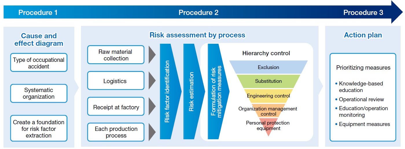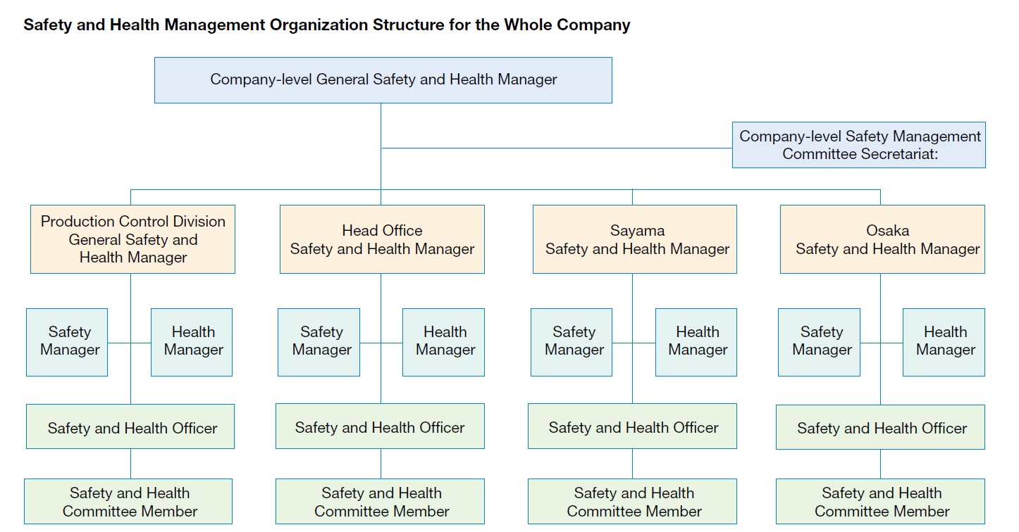 The sustainable growth of the Company is essential for the realization of a workplace environment where every employee can work safely and securely, while staying healthy in both body and mind. The Production Control Division (combined for the six factories in Iruma City) and the large-scale business bases at the head office, Sayama, and Osaka undertake core activities to maintain and enhance safety and management. This includes discussions between labor and management on measures toward identifying potential workplace risks and promoting health, which we link to specific improvement activities.