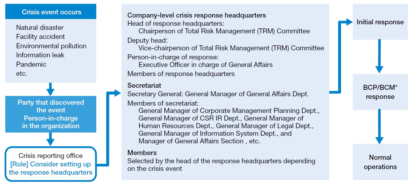 In the event of a disaster or accident, or when there is a risk of such an occurrence, employees promptly report the situation and take emergency measures to ensure safety. We thoroughly investigate the root causes and develop and implement preventive measures to avoid a recurrence.