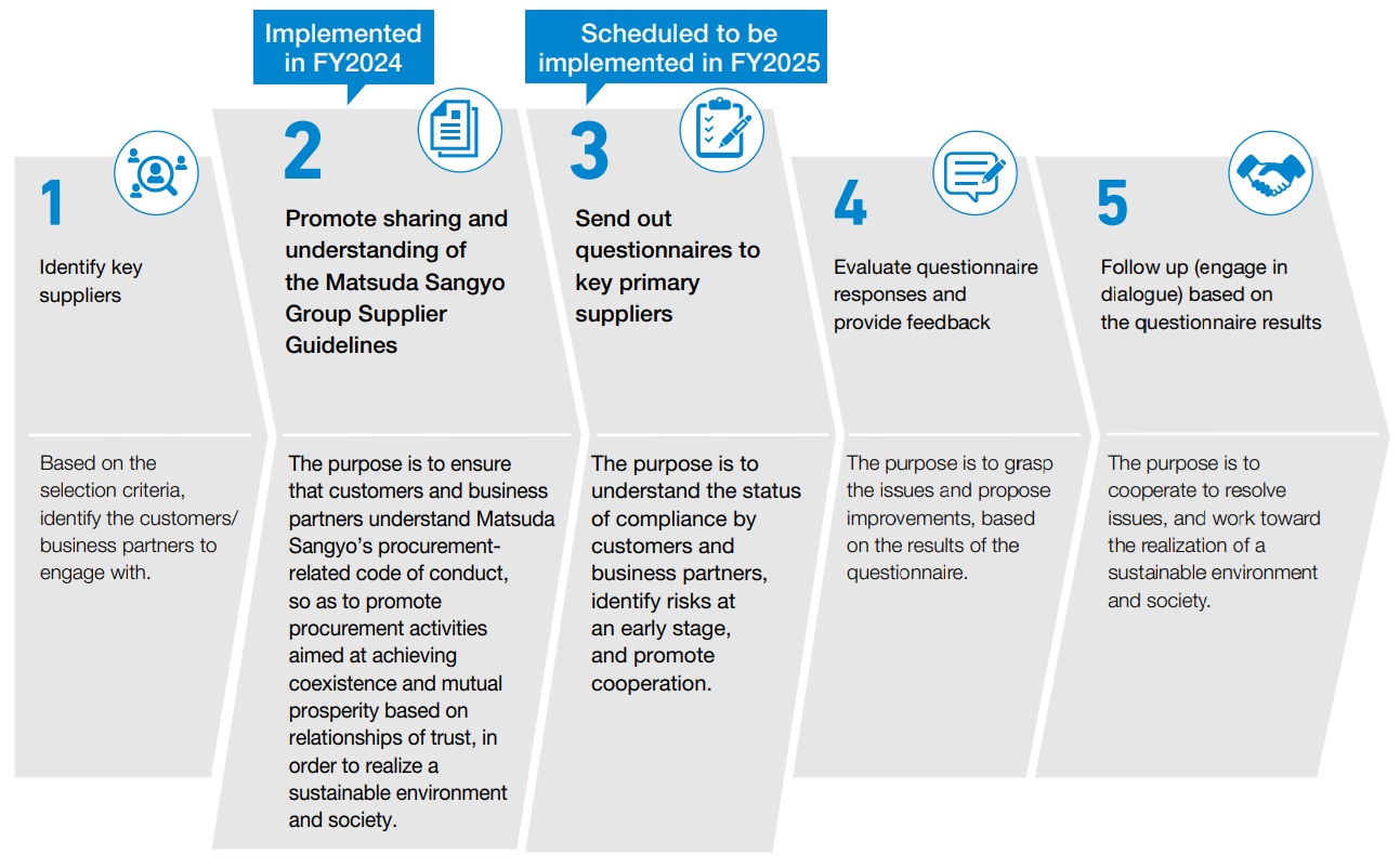 Through the publication of the Matsuda Sangyo Group Supplier Guidelines and other initiatives, we ask for the understanding and cooperation of our business partners, and at the same time, work on building supplier engagement with our key business partners to strengthen relationships and achieve coexistence and mutual prosperity