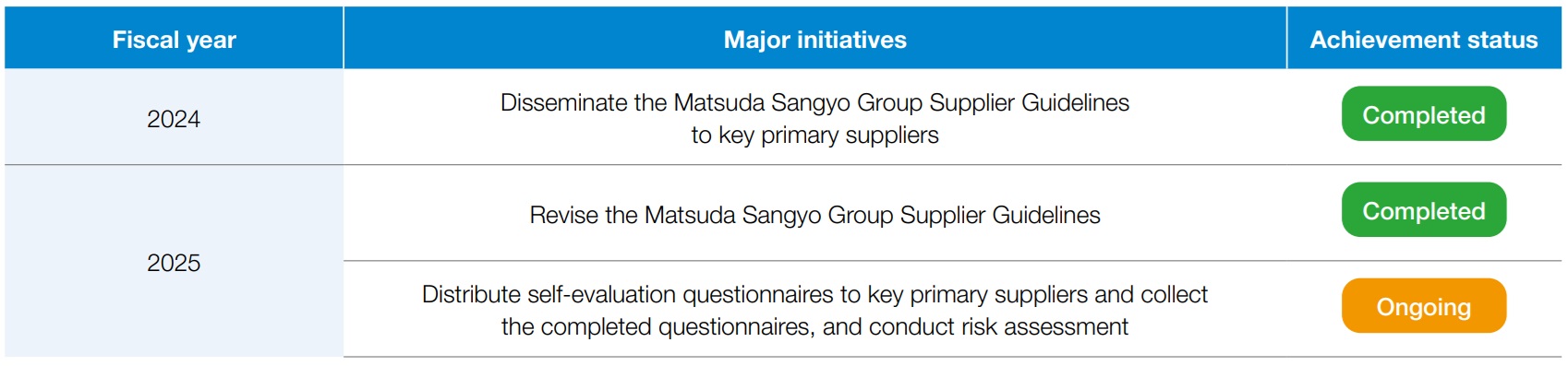 In FY2025, we plan to disseminate the Matsuda Sangyo Group Supplier Guidelines (2nd edition), with contents revised to align with the RBA Code of Conduct, and request submission of a letter of consent. By asking our suppliers to conduct activities in accordance with the Guidelines and promptly report any deviations, we aim to enhance understanding of the status within the respective companies, enable early identification of risks in the supply chain alongside the corresponding response, and promote cooperation with our business partners.