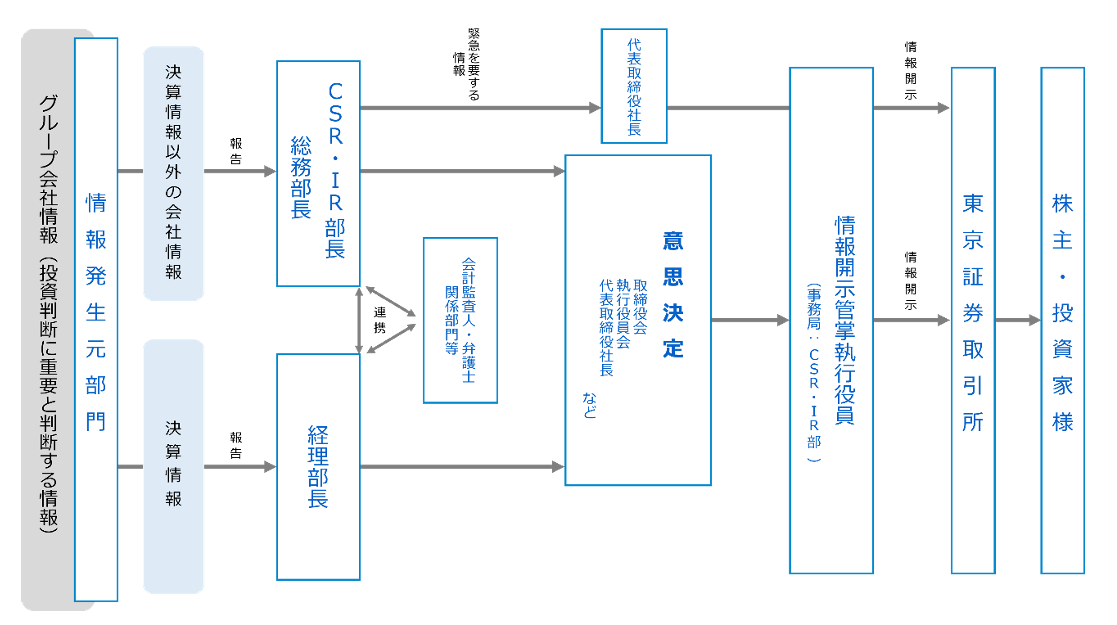 当社は、適切な情報開示および株主・投資家との建設的な対話を実現するために、情報開示管掌執行役員を定め、情報開示管掌執行役員を責任者とするCSR・IR部を設置し、株主・投資家窓口として社内部門との連携を図っています。開示対象となり得る重要情報は、関係部門から情報開示管掌執行役員およびCSR・IR部へ速やかに報告され、網羅性と正確性の確保に努めています。収集された情報は、開示の是非や開示内容を検討したうえで、原則として取締役会での決議を経て情報開示管掌執行役員の指示のもと、CSR・IR部が責任を持って開示します。発生事実など緊急を要する情報については、代表取締役社長の承認により迅速に開示を行い、適時性の確保に努めます。対話を通じて株主・投資家から頂いたご意見等は、 その活動内容と共に定期的に取締役会並びに監査等委員会にフィードバックし、日頃の IR 活動や経営の改善に役立てています。また、対話に際しては、重要かつ未公表な内部情報(イ ンサイダー情報)が外部に漏洩することを防止するため、内部者取引管理規程に基づく社内教育を行うとともに、情報管理の徹底を図っています。