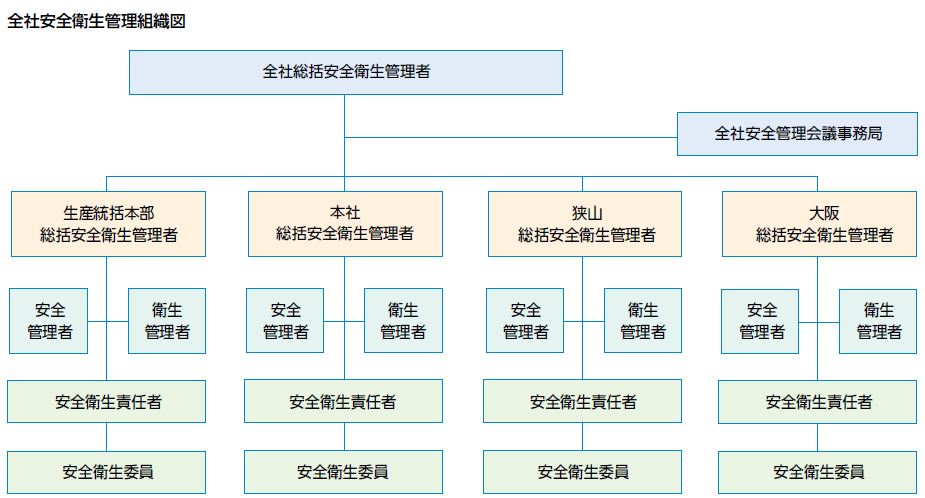 従業員一人ひとりが心身ともに健康で、安全・安心に働ける職場環境の実現は当社の持続的成長に不可欠です。生産統括本部(入間市6工場合同)・本社・狭山・大阪といった大規模な各事業場では、安全衛生の維持向上に向けた中核的な活動として、職場に潜むリスクの洗い出しや健康の増進に関する施策を労使で協議し、具体的な改善活動につなげています。