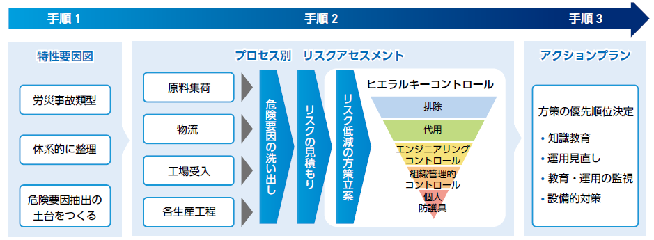 エレクトロニクス業界では、すべての労働者が安全・安心な労働環境で業務に従事できるよう、RBAが定める行動規範に基づき、企業とその一次サプライヤーへの浸透を図っています。当社グループは、「安全は全てに優先する」との行動指針に基づき、国際的な基準であるRBAが定める行動規範を支持し準拠する体制を整備中です。職場の多様性を前提として、妊産婦、外国人労働者などすべての働く人々の労働環境を整備すべく、ヒエラルキーコントロールを活用して、「危険の芽」を摘む活動に取り組んでいきます。