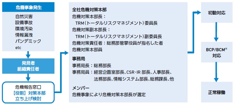当社グループでは、自然災害や設備事故、環境汚染、情報漏洩等、各種危機事象を取りまとめ、有事の際の対策組織、 対応手順を文書化しています。また、各種事例の発生を想定した対応訓練を年間で計画し実施することで、手順の確認と 改善を繰り返し、対処能力の向上に努めています。万が一の有事の際、「速やかに」「適切に」対応できる体制を構築して います。