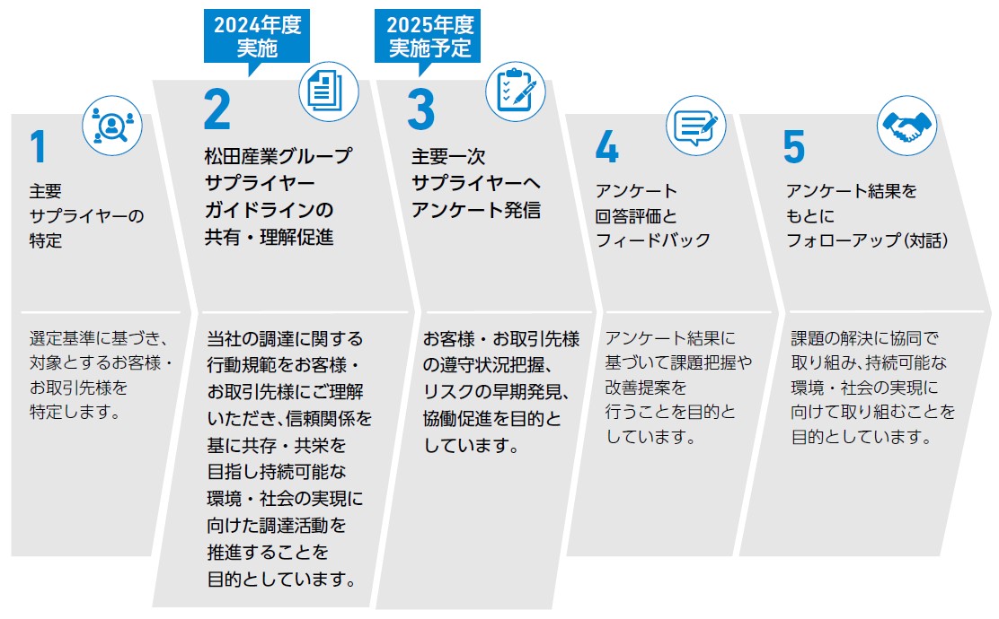 当社グループは、「松田産業グループサプライヤーガイドライン」の公表などを通じて、お取引先様のご理解・ご協力をお願いするとともに、主要なお取引先様との間で、関係強化と共存・共栄に向けたサプライヤーエンゲージメントに取り組んでまいります。