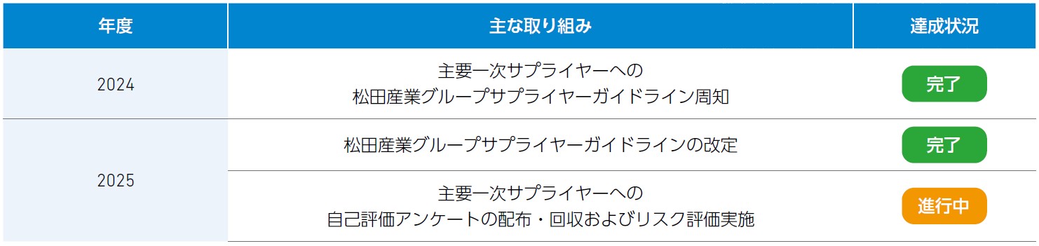 2025年度には、RBAの行動規範に則した内容に改定した「松田産業グループサプライヤーガイドライン(第2版)」の発信と「同意書」の提出を依頼する予定です。サプライヤーの皆様には、ガイドラインに沿った活動や逸脱時の速やかな報告を求めることで、自社の状況把握、サプライチェーン上のリスクの早期発見と対応、お取引先様との協働促進を図ります。